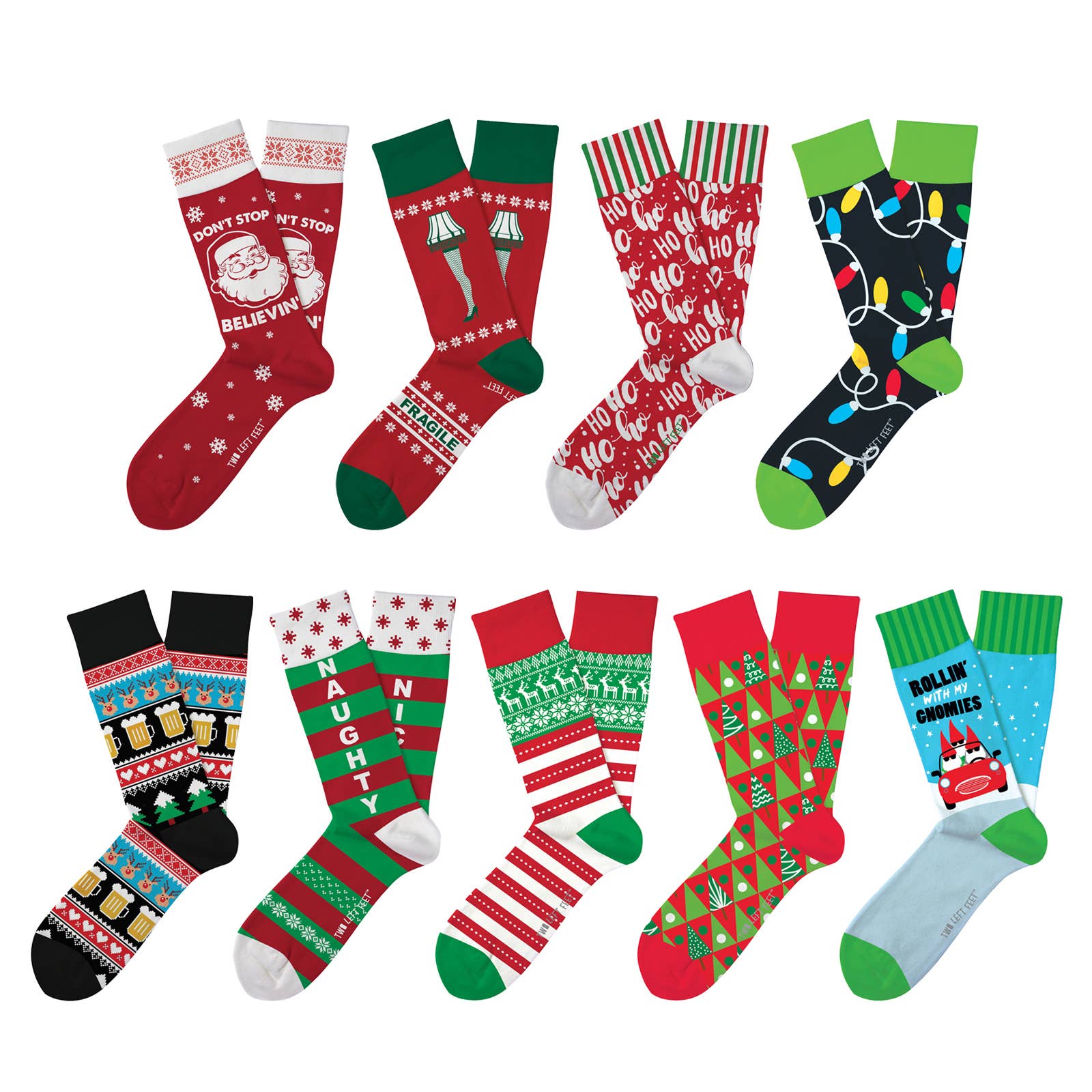 Yuletide styles for the whole season! The Christmas Collection by Two Left Feet Sock Co. is a unique assortment of high-quality socks in nine Santa-approved designs. Makes a great add on to the Everyday Assortment. Trip on this!